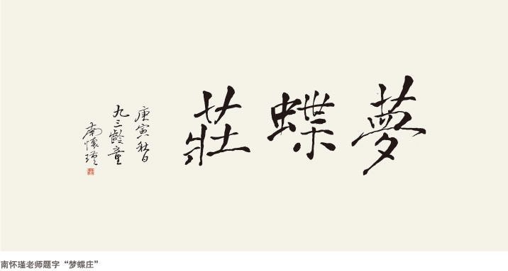 “梦蝶庄”的得名跟“梦蝶庄”主人孙冕的经历有关。那是在登珠峰营地的帐篷里做的一个梦:阳光灿烂的清晨,花朵动起来,最后都变成蝴蝶。“这个梦醒过来,名字就有了,便叫‘梦蝶庄’。”取庄周梦蝶之意,那是物我两忘的境界。“我们的生活态度和理念,都可以在梦蝶庄这个名字中装进去。”从珠峰回来之后,他专门去硅湖拜访了南怀瑾,请老师题写了“梦蝶庄”的匾额,南怀瑾曾经讲过庄子。根据讲课内容整理的《庄子諵譁》一书在大陆流传甚广。
